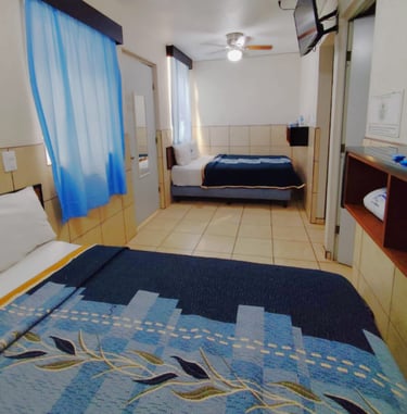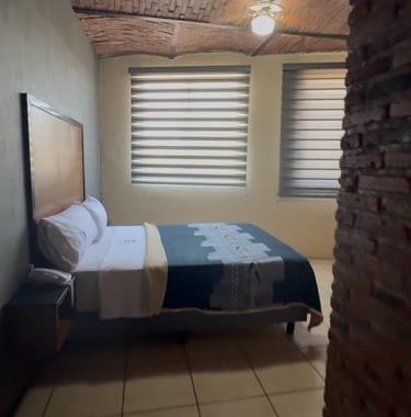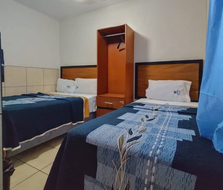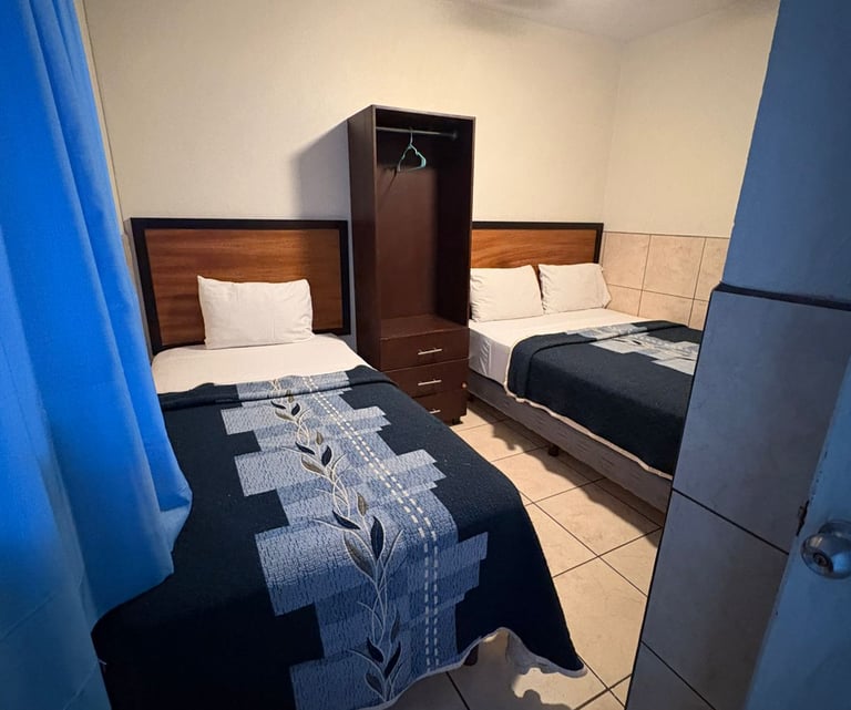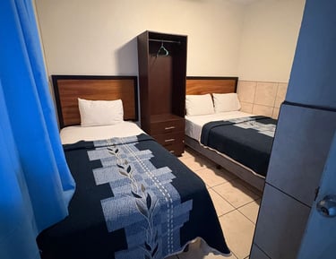 Cuenta con dos camas matrimoniales, televisión, teléfono, un clóset amplio, baño completo y dos ventiladores de techo que aseguran una estancia fresca y confortable.