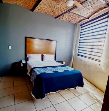 Está equipada con una cama matrimonial, televisión, teléfono, ventilador y baño completo, brindando todo lo necesario para tu descanso.