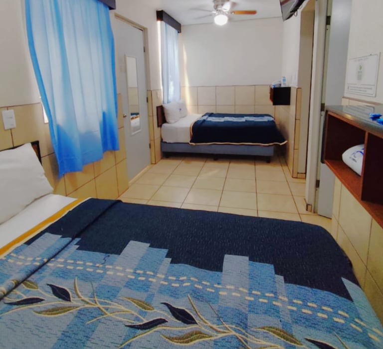 Cuenta con una cama matrimonial y una cama individual, televisión, teléfono, ventilador y baño completo, ofreciendo un espacio práctico y acogedor para tu descanso.